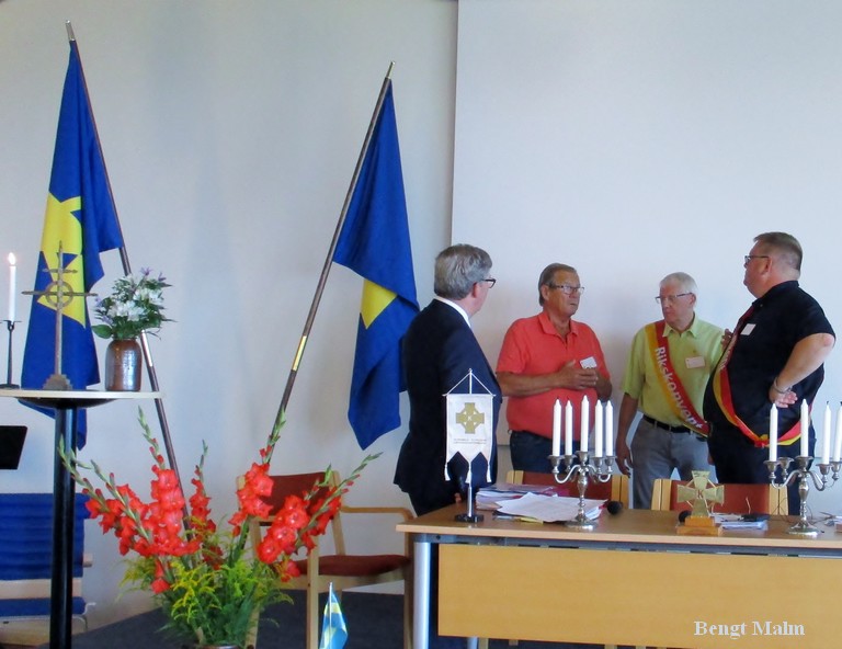 Konventsledningen samtalar inför förhandlingarna. Längst till vänster syns förbundets ordförande Anders Nordberg och brevid honom förbundskassören Juhani Ahonen. Magnus Wittgren (längst till höger) ledde förhandlingarna. 2018 fyller Lekmannaförbundet 100 år. Vid förhandlingarna beslöt ombuden att vi då skall ha ett jubileumskonvent i Uppsala stift. Arrangemangen var utmärkta. Därför ser många fram mot jubileumskonventet. Bengt Malm
